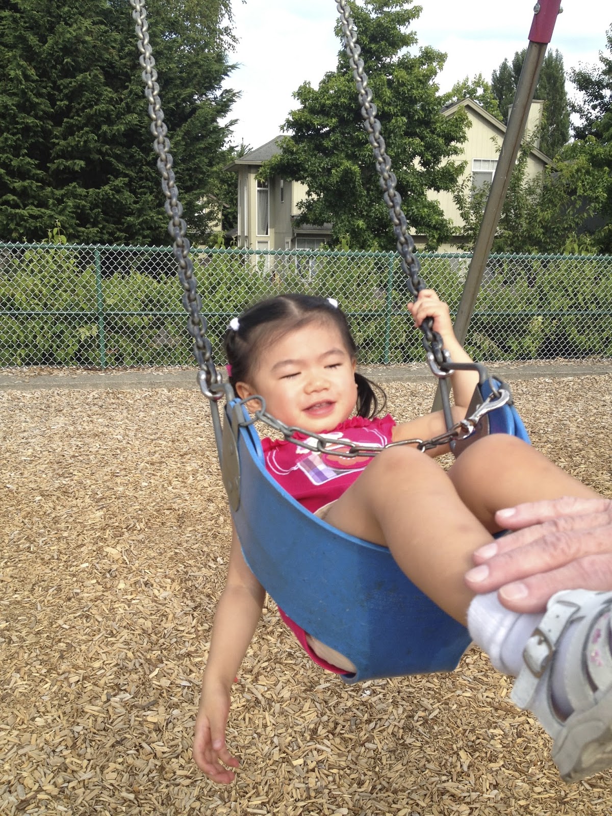I've said before how much Katie loves the outdoors. She happy to just go outside and observe her surroundings, but she also loves to go out and play. One of her favorite playing places is still the playground at the school, and her favorite activity is still swinging. She's been walking to the playground, having some play time, and then walking home. It's a fun time for her.